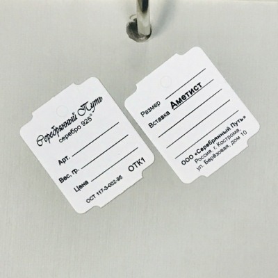 Для печати на ювелирных бирках рекомендуется использовать термотрансферную ленту типа СМОЛА(RESIN)  F300P, XF-U, XF-D9 или ВОСК\СМОЛА(WAX/RESIN) F200P, F200S. На бирке можно печатать как с одной стороны, так и с другой.