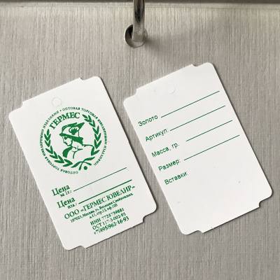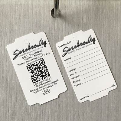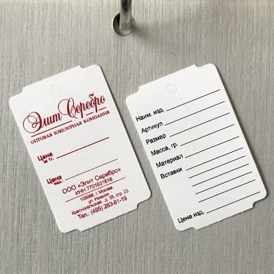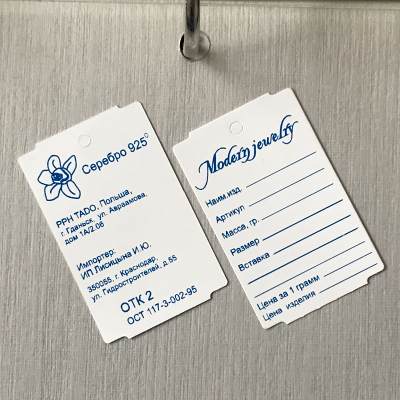 Ювелирная бирка 32х50.8 с двухсторонней печатью вашей информации одним цветом. Изготовлена ювелирная бирка из синтетического материала Robuskin 2S-200 повышенной прочности толщиной 200 микрон. На бирке сделаны специальные выкусы (метка) для возможности использования в термотрансферных принтерах для печати или допечатки необходимой постоянной или переменной  информации. На бирке также имеется отверстие для крепления к ювелирному изделию диаметром 3 мм.